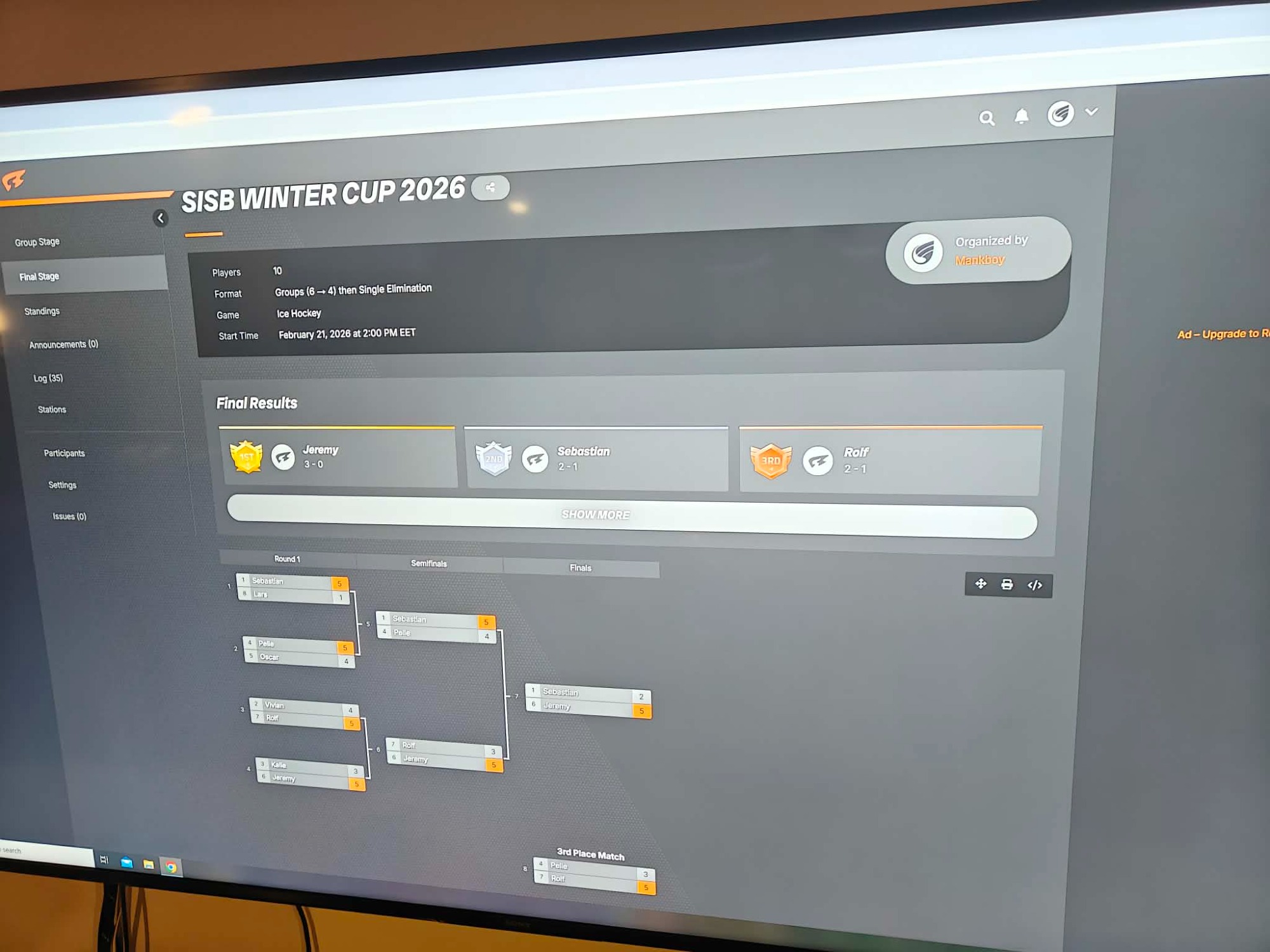 Den fjärde cupen ägde rum den 21:a Februari. Denna gång var värdarna Kalle och Vivian i Masaby. Totalt deltog 10 spelare, varav 7 var antingen rankade eller tidigare rankade, vilket resulterade till en mycket bra spelnivå. Medaljerna tilldelades Jeremy, Sebastian och Rolf - ett välförtjänt erkännande av deras prestationer. Häftigt var ju naturligtvis att vi fick variation på vinnaren -nämligen Jeremy, som slog ut lillbrorsan med fina 5-2. En annan rolig och fin sak var det, att vår gamla räv, Rolf, tog en välförtjänad bronsmedalj!